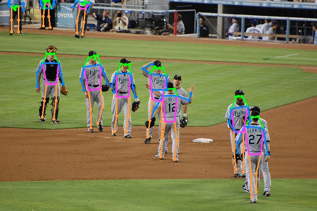 Furthermore, for convenience, the YOLOv7w6Pose model includes an example visualize function. The image at the top of this document was generated using this utility function. The code used is as follows: