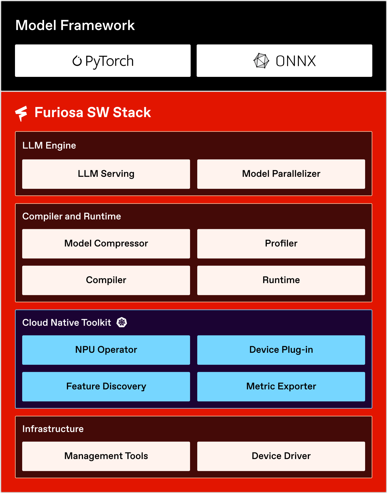 FuriosaAI offers a streamlined software stack that enables the FuriosaAI NPU to be used across various applications and environments. Here, we outline the software stack provided by FuriosaAI, explaining the roles of each component, along with guidelines and tutorials. The following diagram shows the software stack provided by FuriosaAI.